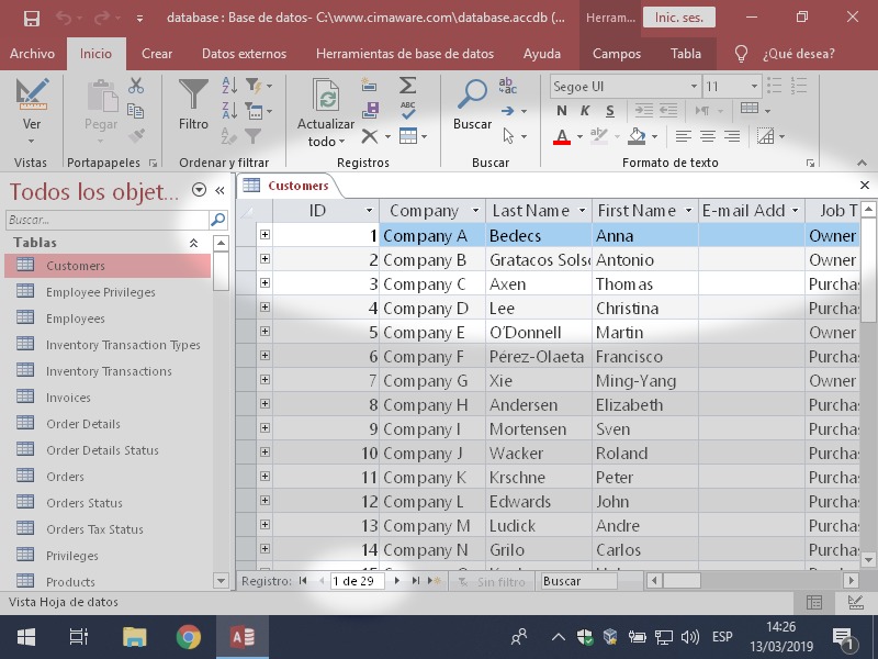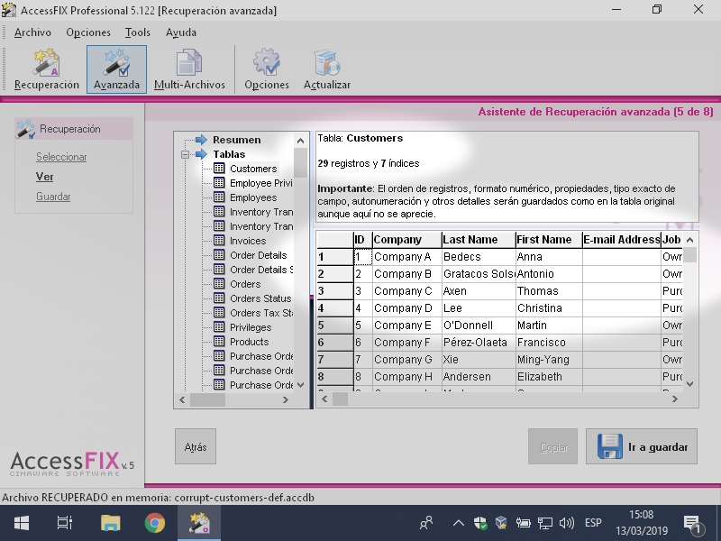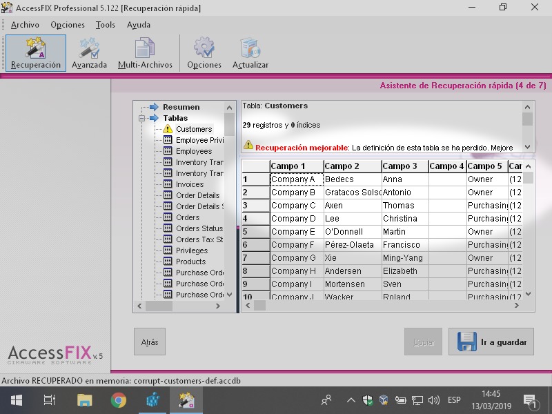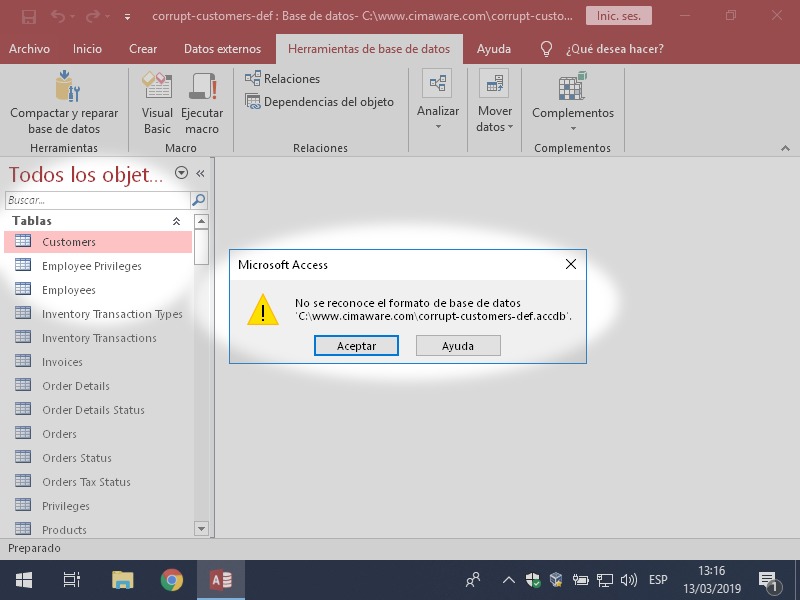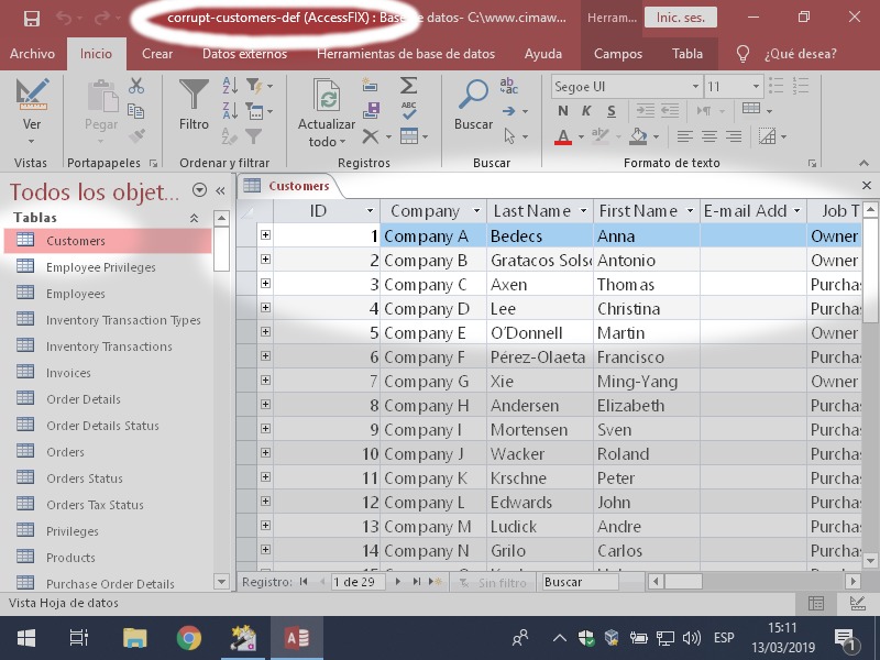 Para hacer las pruebas he usado el archivo corrupt-customers-def.accdb del proyecto Cómo reparé 28 bases de datos dañadas.
