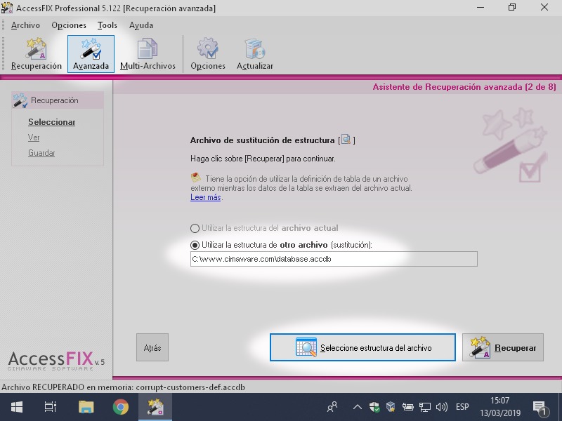 Desde AccessFIX, activamos la recuperación Avanzada y, seleccionamos el archivo dañado. Después, en la opción Sustitución de estructura, seleccionamos la copia antigua. La copia nos aportará la definición que nos falta.