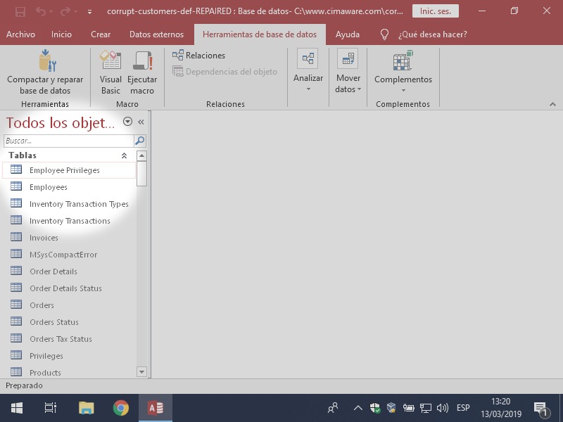 Hagamos una prueba con un archivo que tiene dañada la definición de la tabla Customers. Fíjate en las pantallas que siguen y como la tabla desaparece después de aplicar Compactar y reparar.